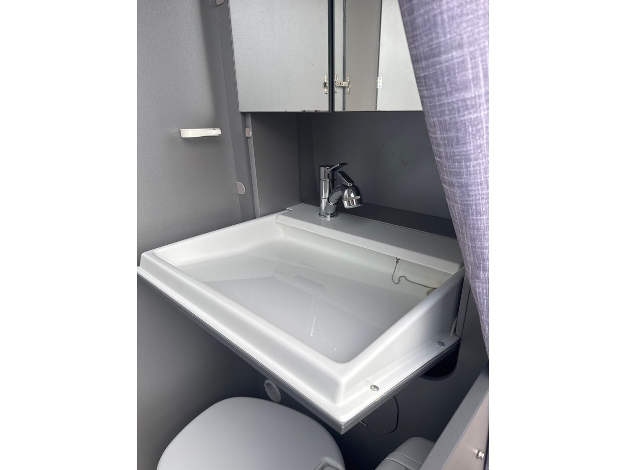 Opposite is a washroom and toilet space, featuring a cassette toilet, a shower tray with splash proof curtains, and a foldable sink that can be stowed away to create extra space.