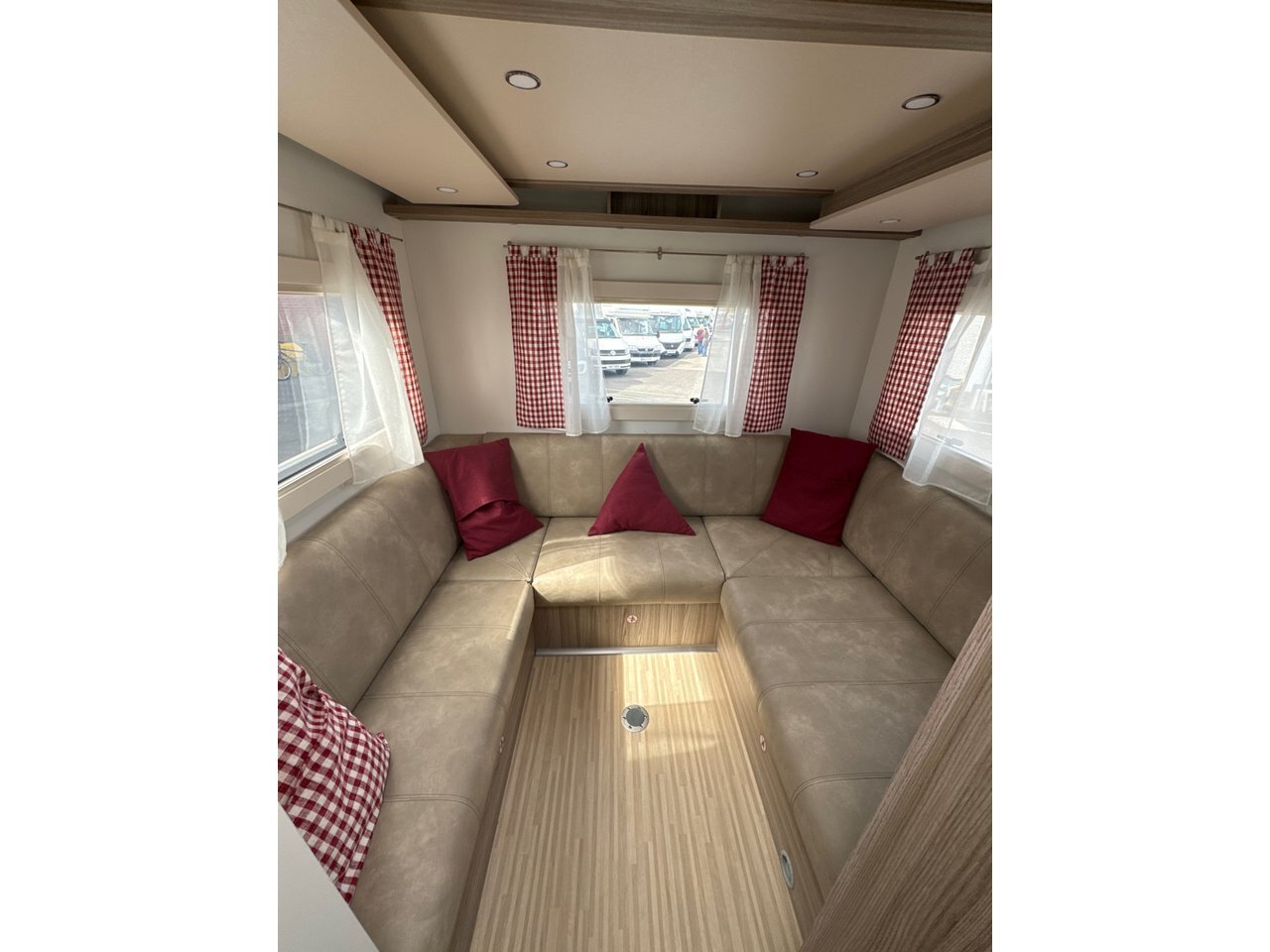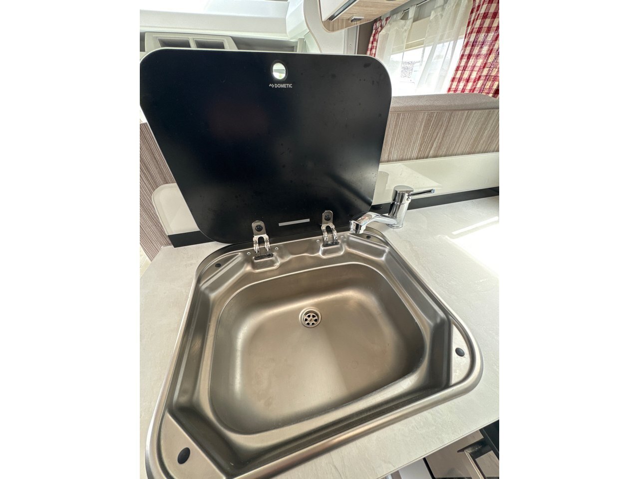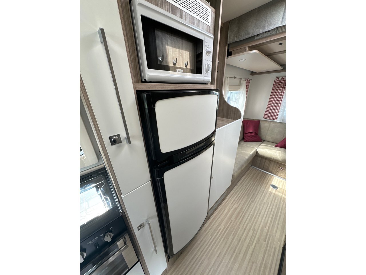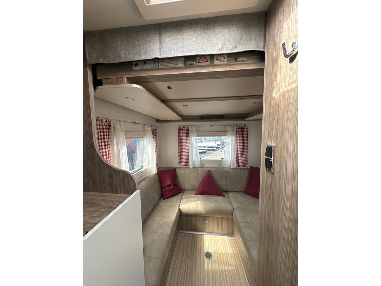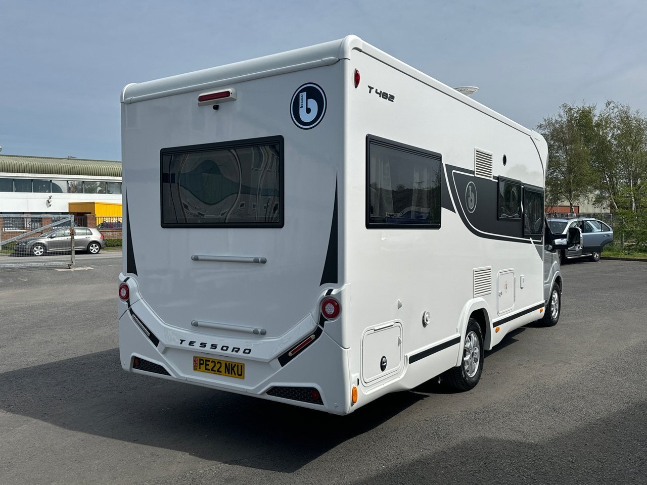 The Benimar Tessoro T482 sleeps up to 4 people, utilising two electric drop down beds, one of which is suspended above a spacious dinette, and one situated toward the rear, suspended over a large communal lounge space. The main upholstery of this vehicle is a well kept brown/cream on the seats, with red and white complimentary accents throughout on the cushions and curtains. There are a total of 4 travelling seats, 2 of which are captains swivel seats in the cab, and two forward seats in the dinette area. This vehicle is equipped with a full kitchen utility area, featuring all the main components; sink, worktop station, gas hob unit with oven, grill, 2 gas cookers and a mains powered hot plate, an extractor fan, a microwave, and a 3-way automatic fridge and separate freezer. There is also plenty over head and underneath storage for all your utensils. Opposite is a spacious washroom housing a sink, cassette toilet, mirrors and cupboard space, and a large shower tray, helping the owner feel more comfortable and less claustrophobic. A shower screen is also fitted to reduce splash across the remainder of the washroom. In the rear is a large seating area which is great for relaxing or a communal gathering for friends. There is a stowaway table in a large storage space adjacent to the lounge that can be installed when stationary to allow for an extra eating and drinking space, or playing games with guests.