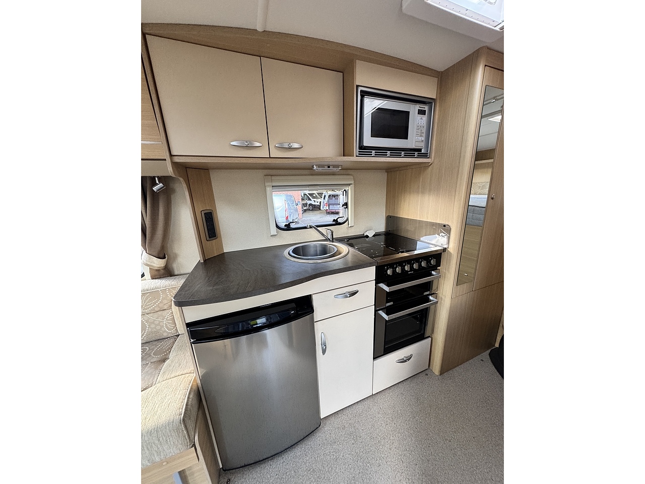 Central kitchen with a full gas cooker unit with hobs, grill, oven and mains powered hot plate. 3-way fridge freezer, good size sink and 12V powered tap, a mains powered microwave, worktop space and lots of storage.