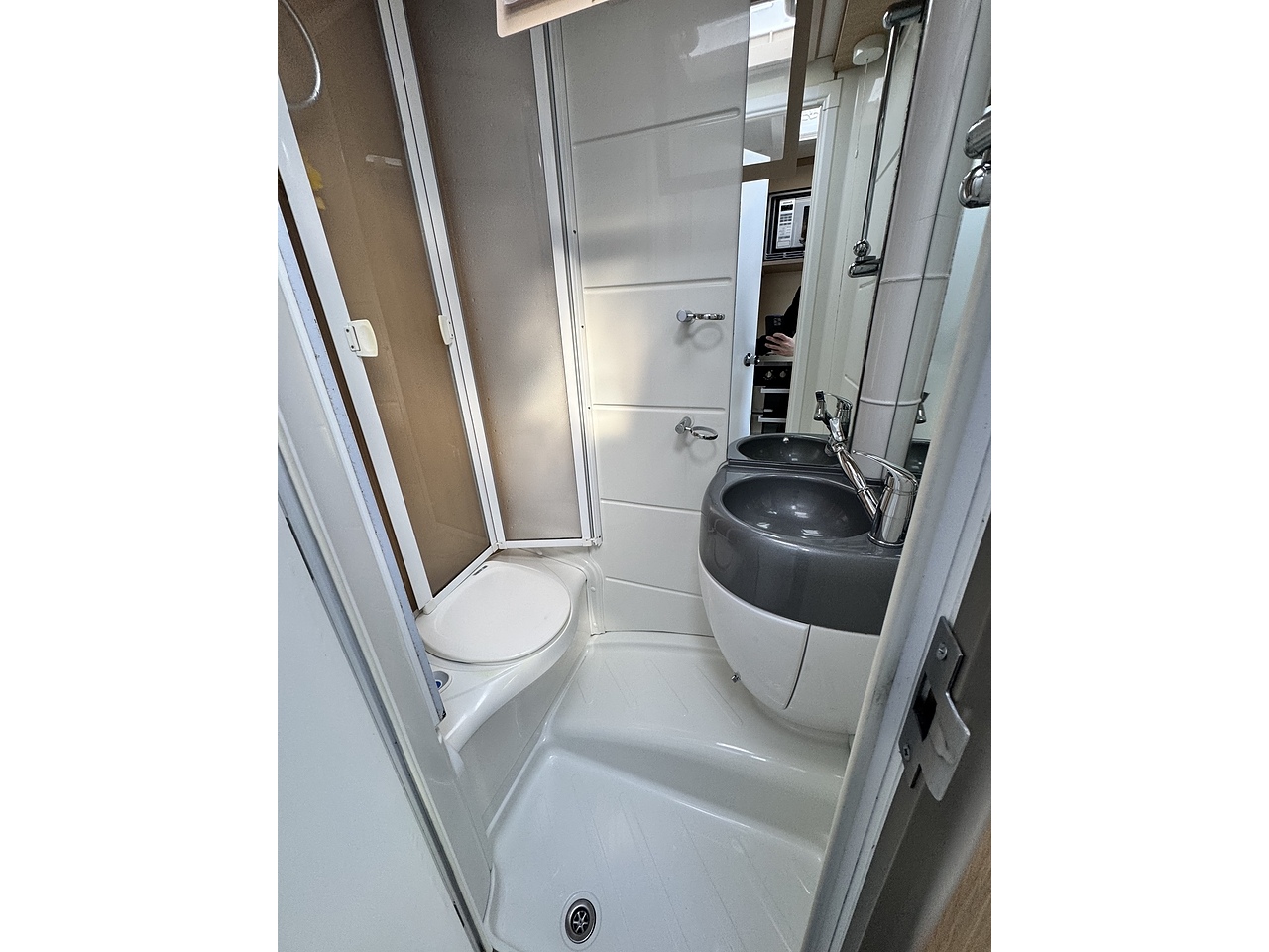 Washroom with a cassette toilet, shower tray and splash proof screens, sink and 12V powered tap, skylight ventilation.