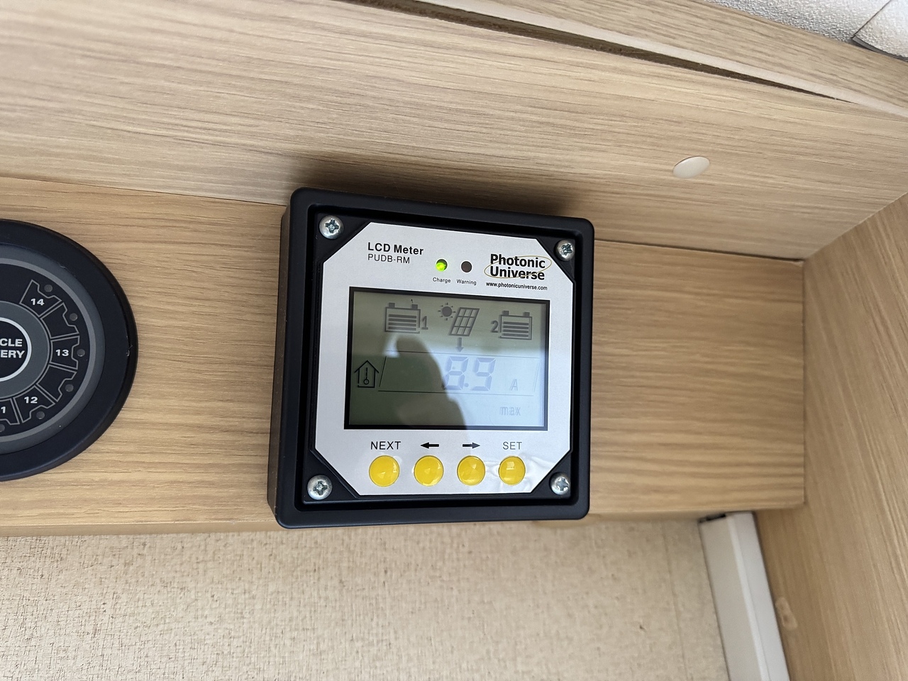 Standard issue master panel with 12V isolation, water pump isolation, tank heater for frost protection, level readings for the water levels and batteries, battery select and habitation lights.