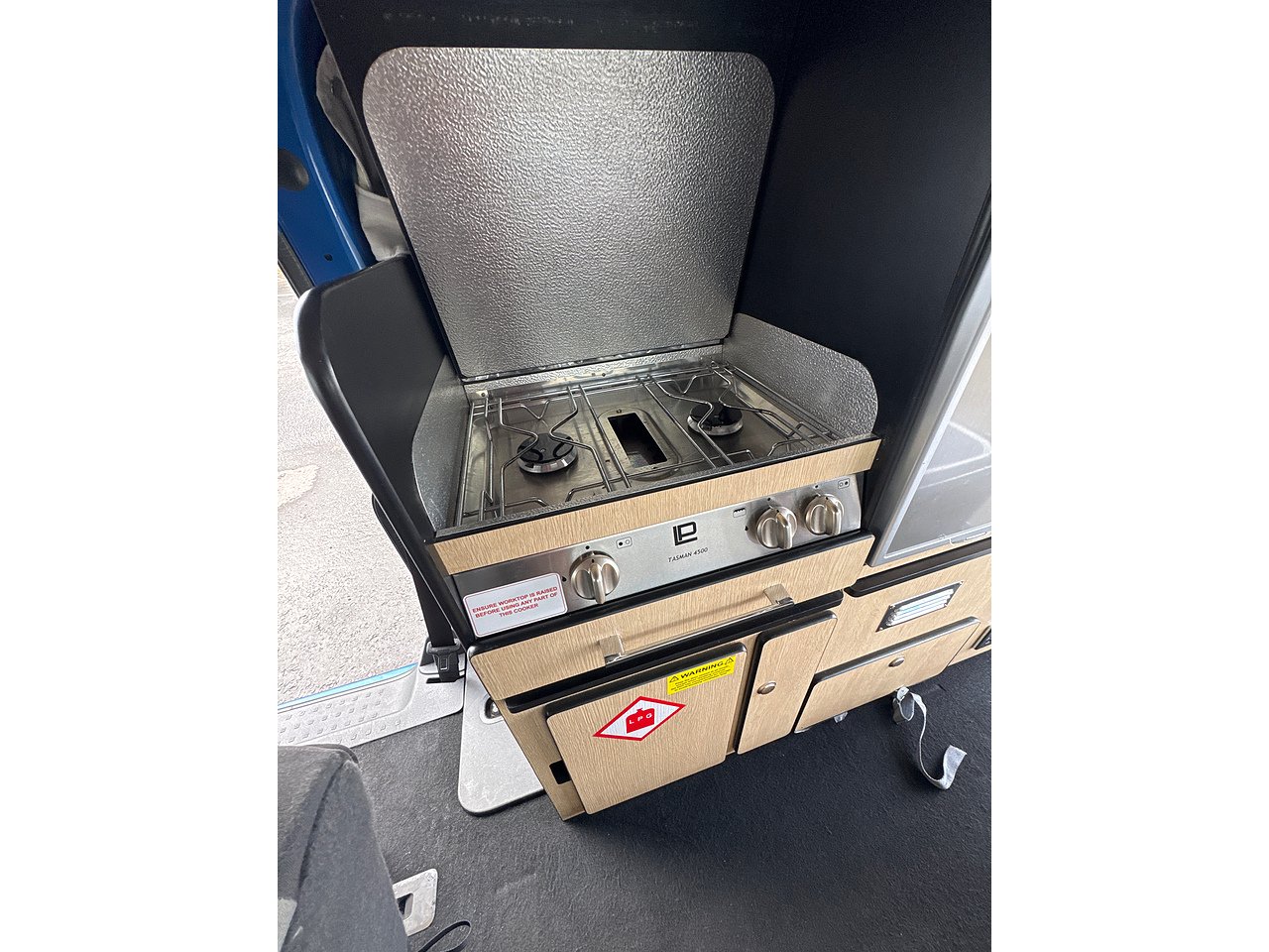 Kitted out with kitchen utilities and appliances, such as a sink and 12V powered tap with an interchangeable water barrel, a 12V compressor fridge and a gas cooker unit.