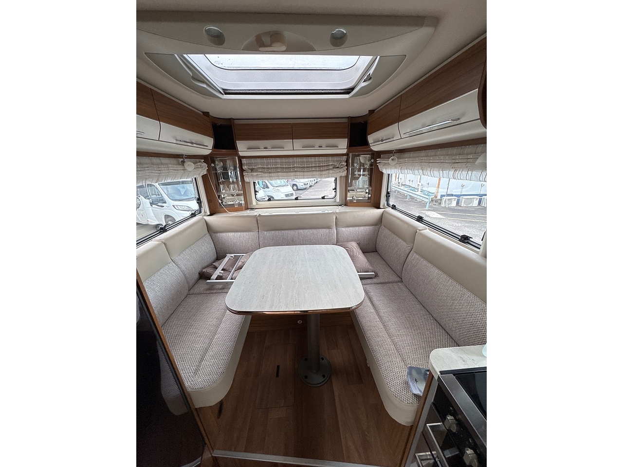 Rear U-shaped lounge and dining area with over head storage, comfy bench seats, lots of natural light and cabinets.
