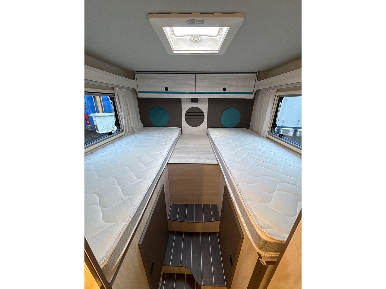 AUTOMATIC - 4 Berth: Rear singles that can be converted into a large double and an over-cab double bed. 4 Travelling seats, 2 of which are captain swivel chairs in the cab.