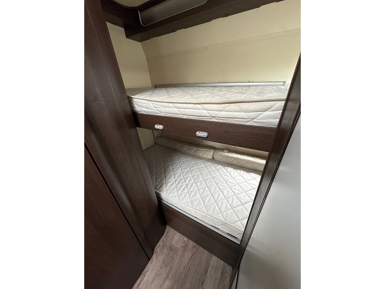 Berth and Sleeping arrangement: 6 Berth. Large over-cab double beds, accessible by ladder, convertible dinette area, 2 rear single bunk beds.