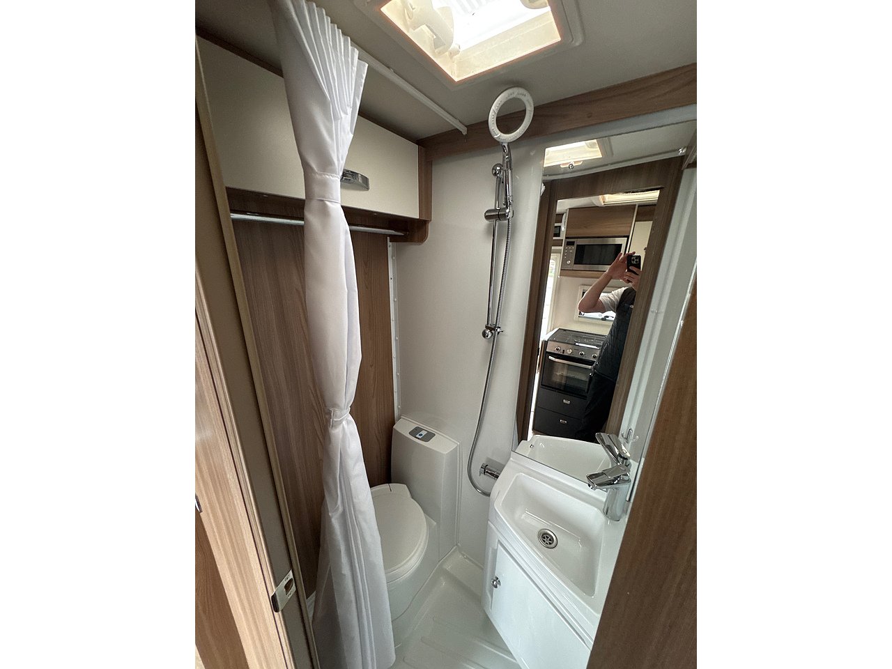 Washroom Features: Shower tray, 12V shower head and splash proof screens. A corner sink, 12V powered tap and a mirror. A cassette toilet that can swivel to adjust the seating position, and a skylight for natural light and ventilation.