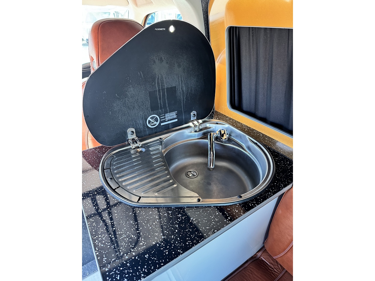 Kitchen appliances: Gas hob, sink, 12V compressor fridge and a mains powered microwave.